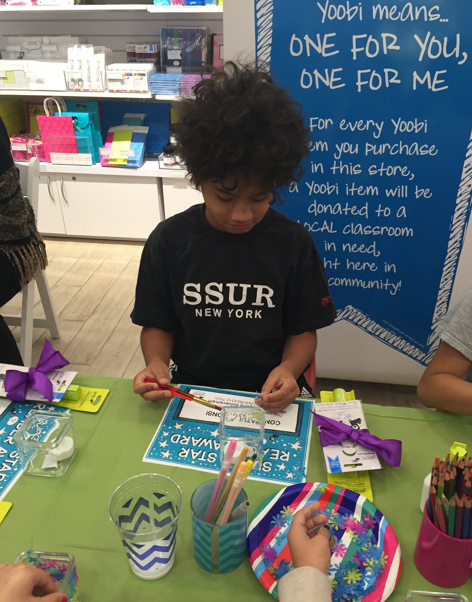 These awesome kids received a special Yoobi goodie bag and got the opportunity to do a fun DIY mod podge activity using Yoobi tissue paper and glue. We cut Yoobi tissue paper into different shapes and the kids got to pick and choose which colors and designs they wanted on their very own candle holders!