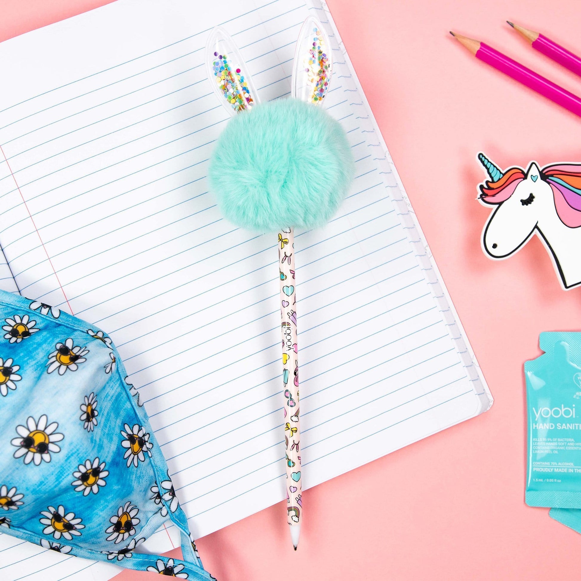 Spice up your Easter basket! This aqua bunny pom pom pen puts the fun in functional. It's traditional blank ink make this pen a funky yet practical addition to any desk, purse, or pencil case. Taking notes, writing letters, and signing papers will be more exciting with its whimsical fluffy shape, confetti filled ears, and colorful Easter themed barrel print.