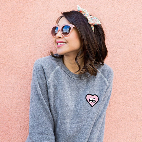 This sweetheart sweater is oh-so-cute. With back-to-school falling close to Fall (*nudge – get it?), it’ll be time to cozy up in Steppie’s embroidered heart patch sweater that matches perfectly with our Gold & Black Dotty tote bag!