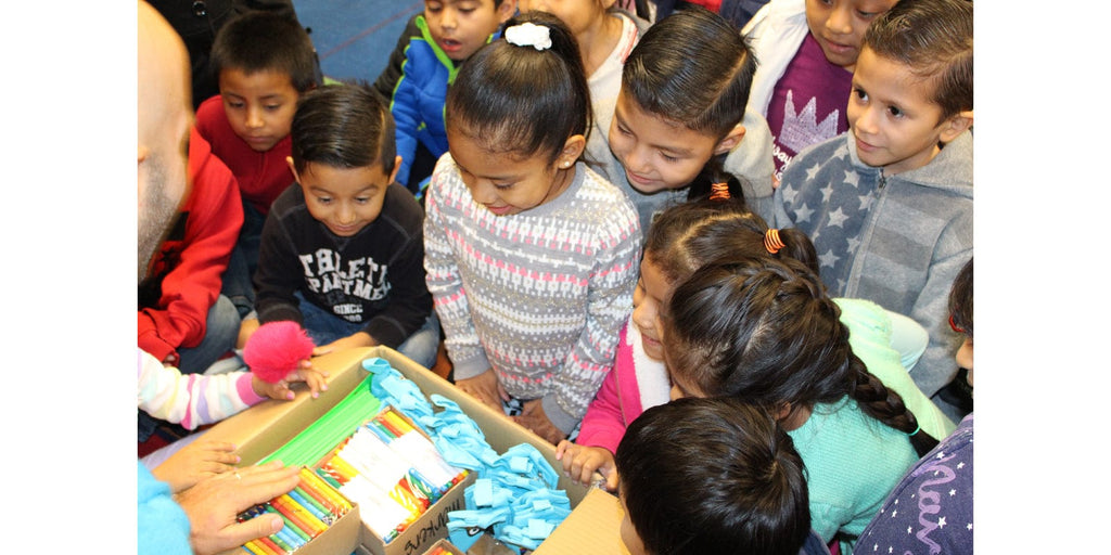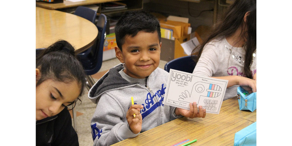 Fast forward to January 12th, 2017. After connecting with Union Ave.’s Principal, Ms. Herrera, who told us about the struggles her students faced every day, and the amazing work her teachers and staff were doing to support them, the Yoobi team arrived on campus that morning so see if we could bring some sunshine into an otherwise cold and rainy day. We opened up the day with a fun assembly for the kids, getting them excited about the supplies they were about to receive. Following the assembly, we took Yoobi Classroom Packs filled with pencils, markers, crayons, glue sticks, rulers, folders, etc. to each of the school’s classrooms, providing over 1350 elementary students with brand new school supplies. For some, it would be the first time they could call a school supply their own. We spent time coloring with the kids, then, fighting tears, we thanked the teachers in front of their kids for all that they do for their special ones.