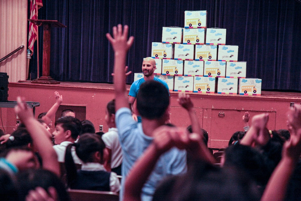 Give Events are special days when the Yoobi Team gets the opportunity to go into a school and hand-deliver Yoobi Classroom Packs to children in schools that need supplies most. Usually, we hold an assembly with the entire school to introduce who we are and then deliver classroom packs one by one to classrooms inside the school.